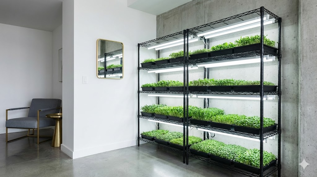 A construção do seu ambiente de cultivo não exige reformas estruturais complexas, mas demanda inteligência logística. Imagine o seu espaço não como uma varanda, mas como uma linha de montagem biológica. O coração desse sistema é a estante aramada, que permite a circulação de ar e a passagem de luz, fatores cruciais para evitar a maior ameaça ao seu lucro: os fungos. A escolha do local dentro da sua casa deve levar em conta a temperatura e a umidade. Microgreens são exigentes; eles prosperam em ambientes que nós, humanos, também consideramos confortáveis. Se está muito quente para você, está muito quente para eles. Se o ar está estagnado, seus lucros apodrecerão antes da colheita.